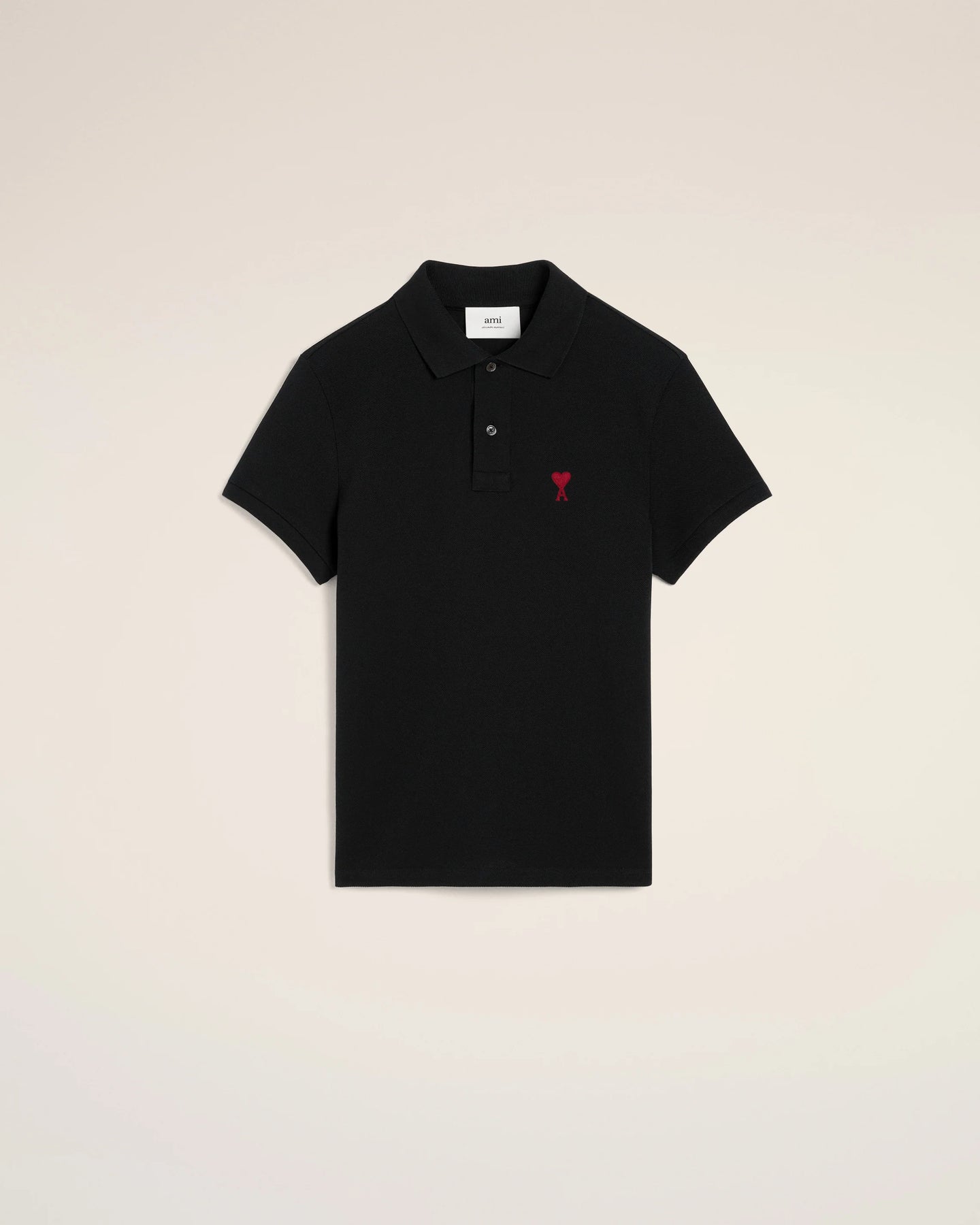 التصميم: قميص بولو كلاسيكي بأكمام قصيرة باللون الأسود النفاث ، يتميز بشعار القلب الأحمر المطرز الشهير على الصدر .